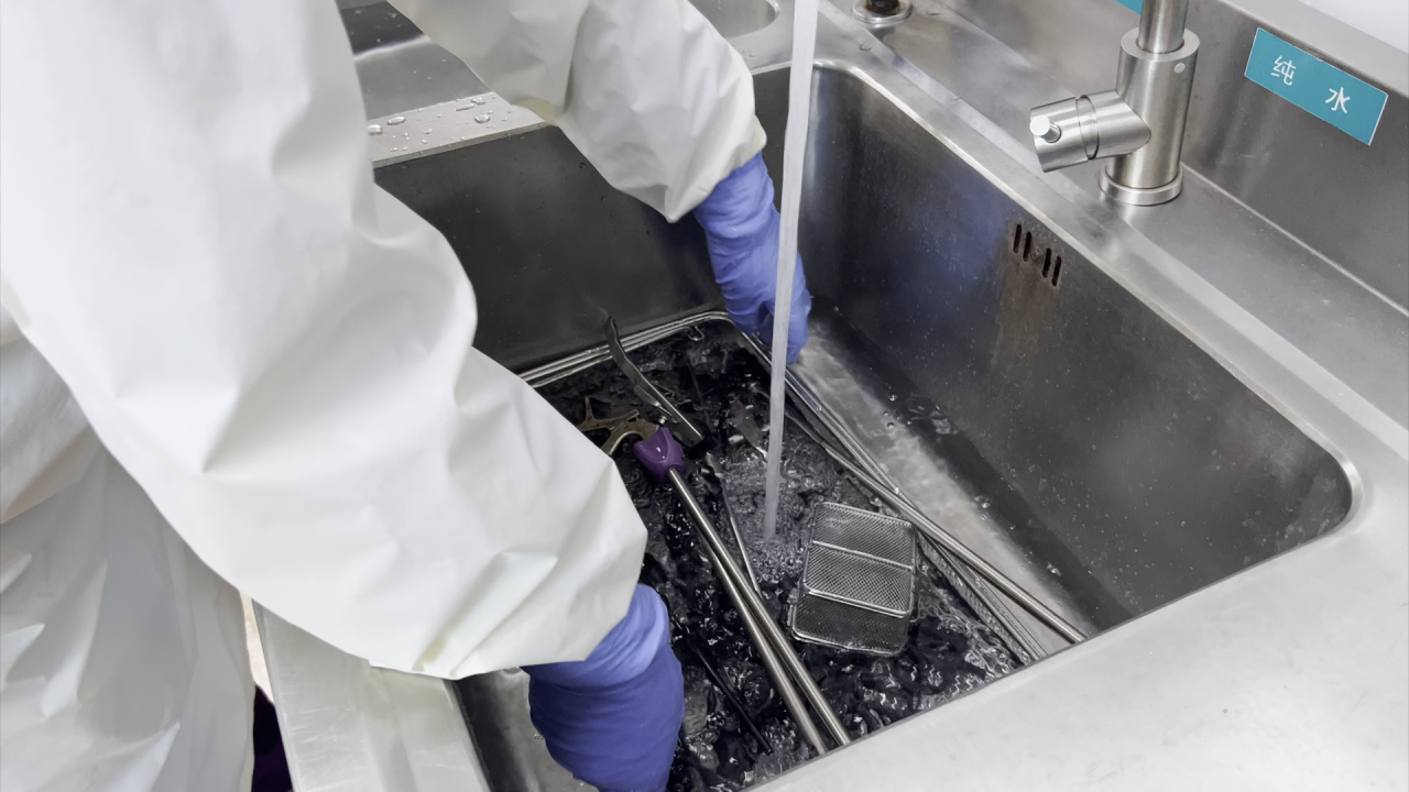 到達(dá)消毒供應(yīng)中心去污區(qū)后,工作人員會在流動水下輕輕沖洗我的身體表面,特別注意我復(fù)雜的齒紋、關(guān)節(jié)和管腔內(nèi)部。
